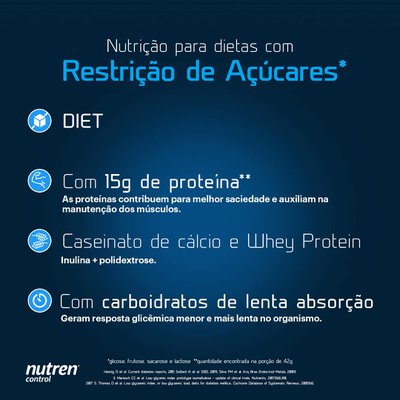 Pó para o preparo de bebidas para dietas com restrição de sacarose, frutose, glicose e lactose. Contém isomaltulose, um carboidrato de lenta absorção com baixo índice glicêmico. Diet, rico em proteínas (15g na porção*), fonte de fibras, ômega-3 e vitaminas e minerais. Isento de glúten e lactose.*na porção preparada de 200mL. |