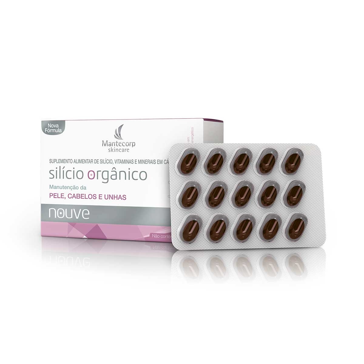 O Silício Orgânico Nouve é um nutricosmético em cápsulas, ou seja, um tipo de suplemento alimentar também conhecido como “suplemento de beleza”. O silício é um mineral fundamental para o funcionamento saudável do organismo, atuando, entre outras frentes, na regeneração da pele e no fortalecimento dos cabelos e unhas. Ele pode ser obtido em uma dieta rica em frutas, legumes, verduras e cereais, mas também por suplementos de silício orgânico, como o Silício Orgânico Nouve, da Mantecorp. A fórmula do Silício Orgânico Nouve é composta por uma associação inteligente de ativos que, juntos, agem para o fortalecimento, hidratação e firmeza da pele, unhas e cabelos. É livre de açúcares, calorias e lactose, e não contém ingredientes de origem animal. |
