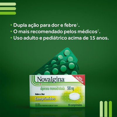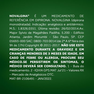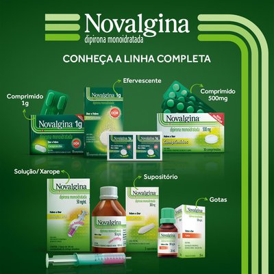Novalgina é um medicamento à base de dipirona, utilizado no tratamento da dor e febre. Tempo médio de início de ação: 30 a 60 minutos após a administração e geralmente duram aproximadamente 4 horas. |
